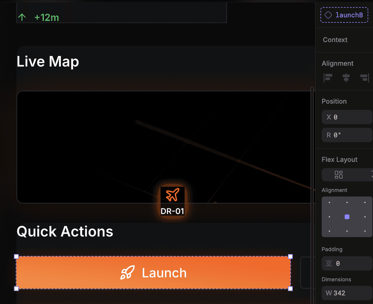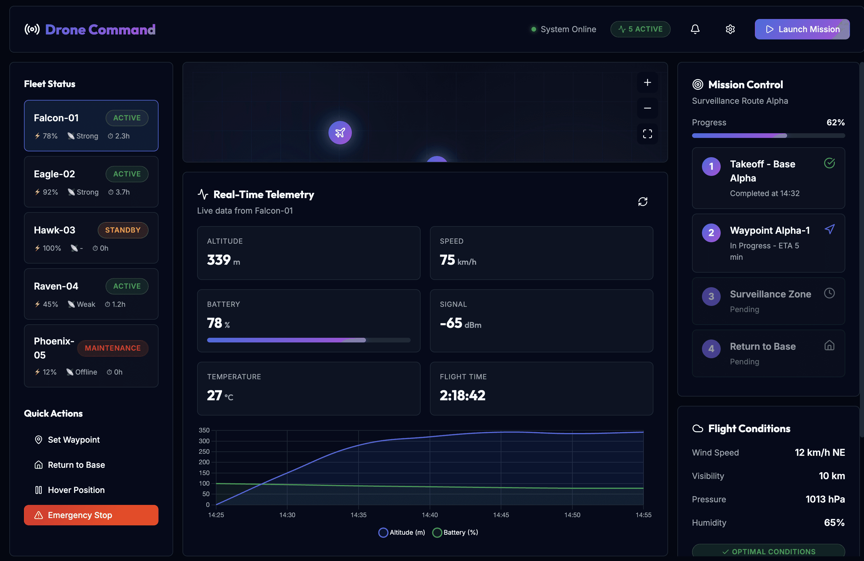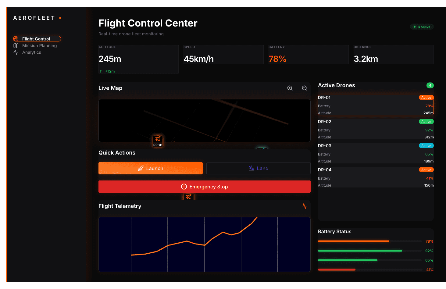 Le pedí que "siendo un Product Designer Specialist creara un Dashboard futurista dark theme para controlar los vuelos de drones usando las reglas css de Tailwind y la librería de componentes Shadcn/ui, aplicando buenas prácticas UX/UI así como de accesibilidad. Crea y aplica las variables necesarias". Y este fue el resultado: