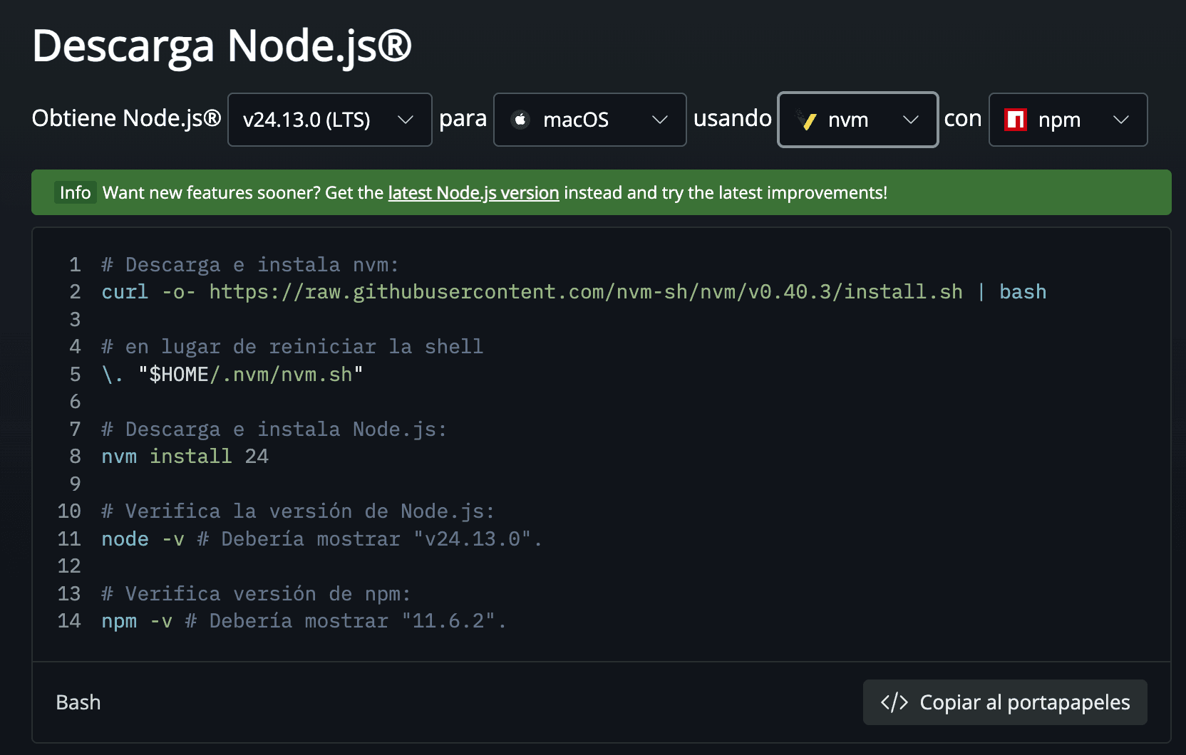 Si no lo tienes instalado te mostrará: ❌ "command not found". Ve a nodejs.org → descarga la última version LTS + nvm + npm → y en laTterminal pega las instrucciones que indica Node (ejemplo):