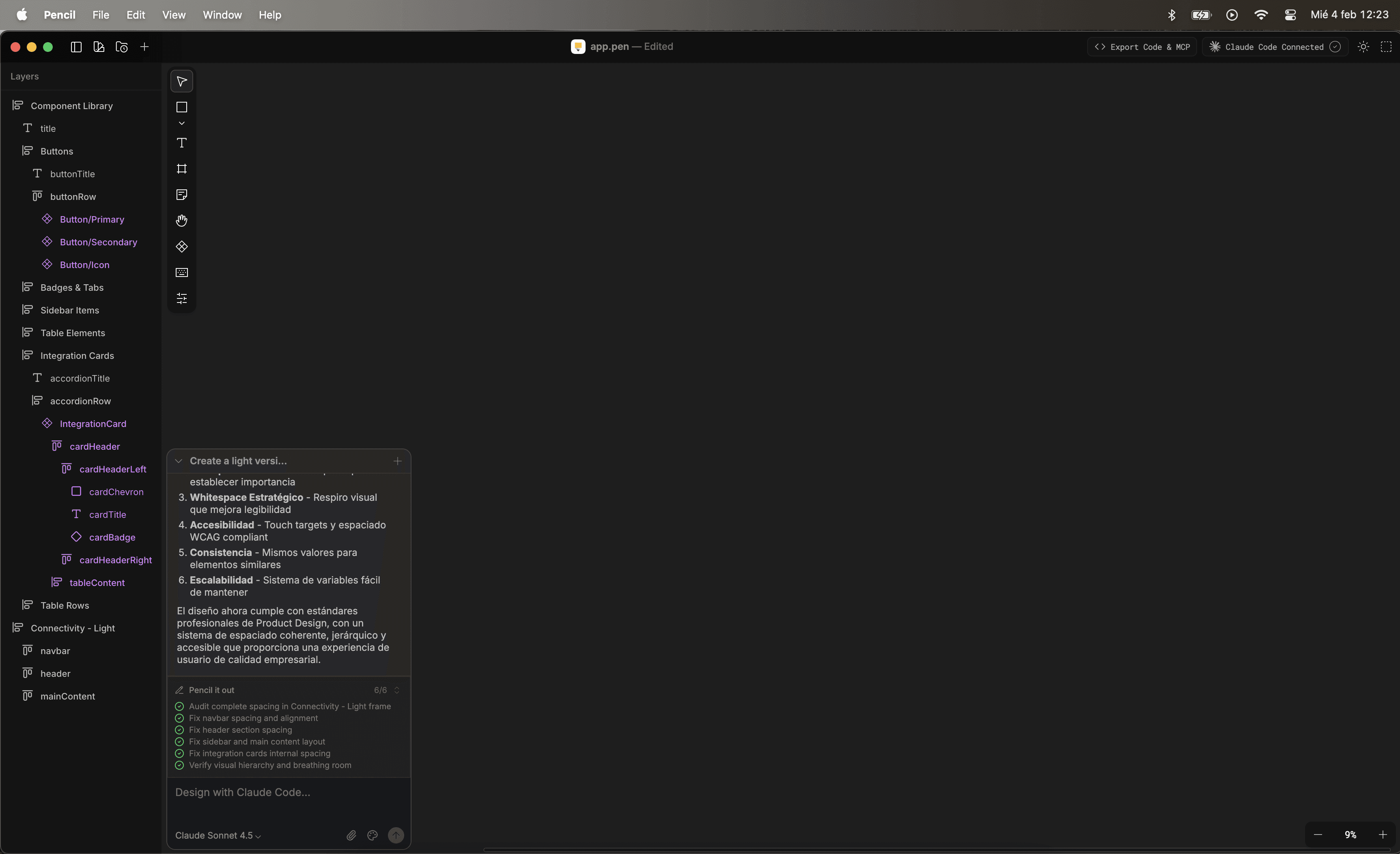 Aunque es posible que no esté haciendo algo bien ya que hay que tener demasiadas cosas en cuenta, diría que, de momento, Figma + MCP sigue siendo más fiable. Pero Pencil tiene potencial brutal – habrá que esperar unos meses para ver cómo evoluciona y bajen precios.