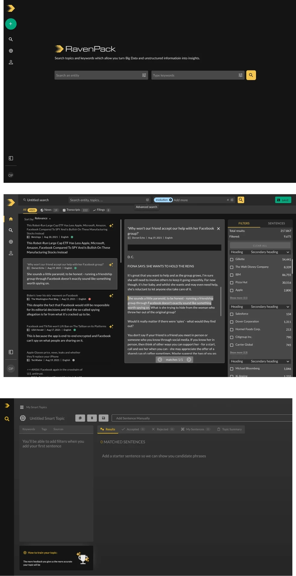 Ravenpack is the world leader in Big Data analytics for the financial sector. Its NLP (Natural Language Processing) engine processes millions of unstructured data points in milliseconds. However, analysts—users under extreme cognitive load—were forced to navigate between two disconnected worlds:
